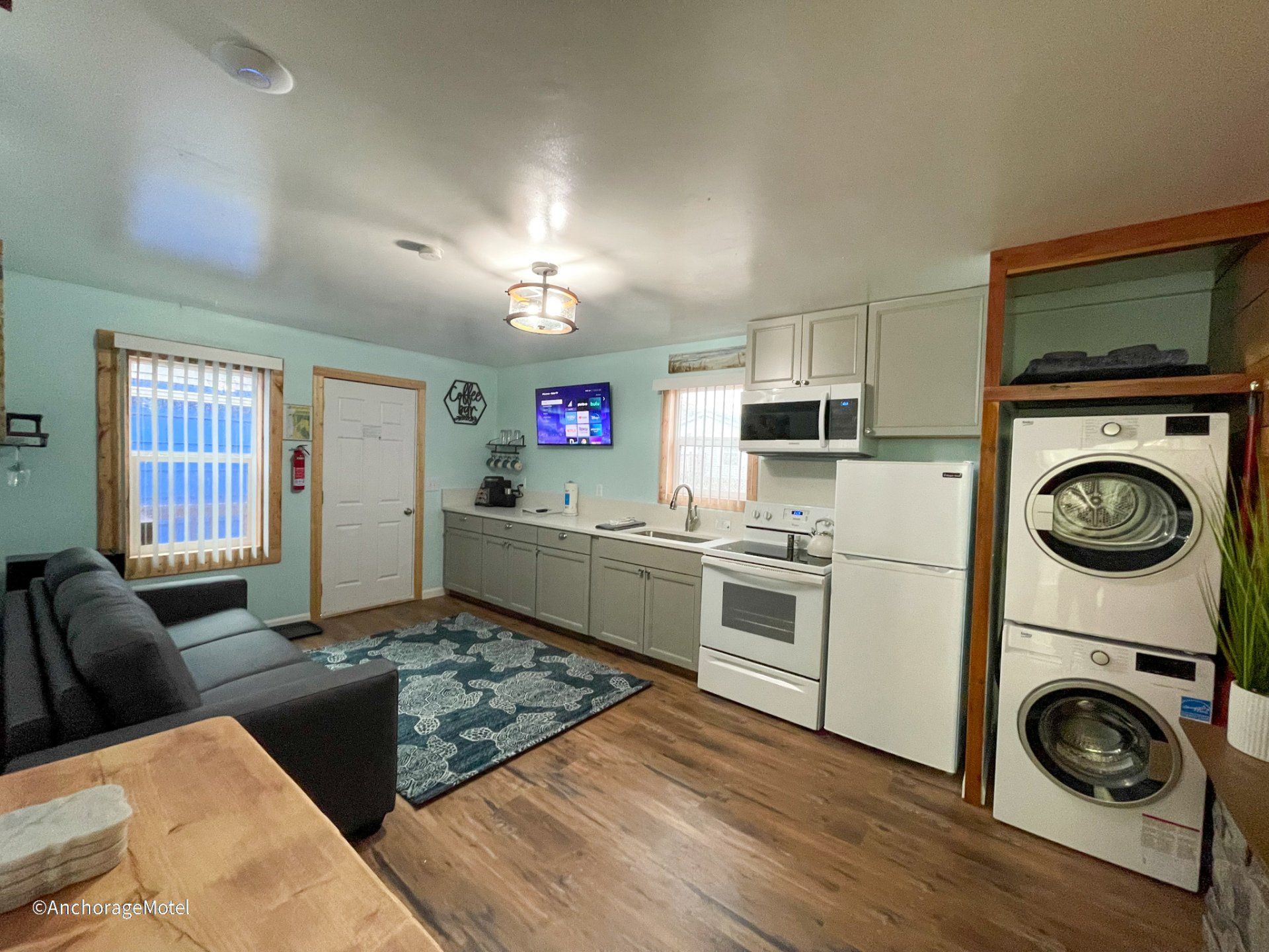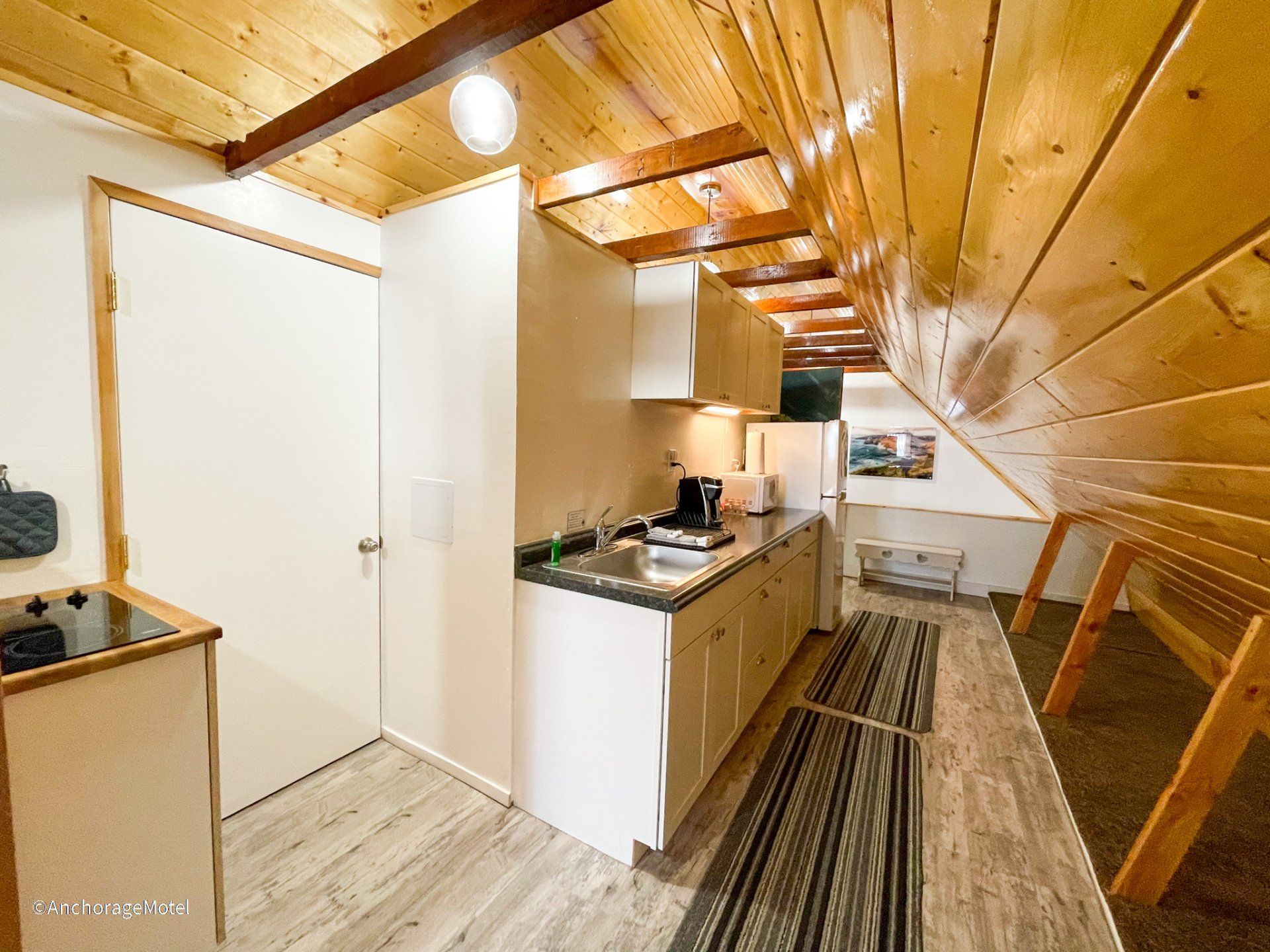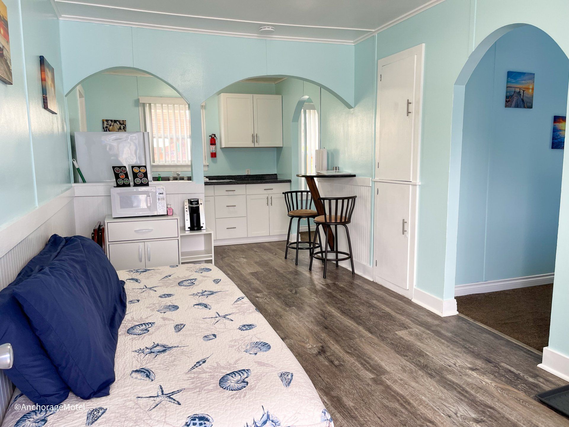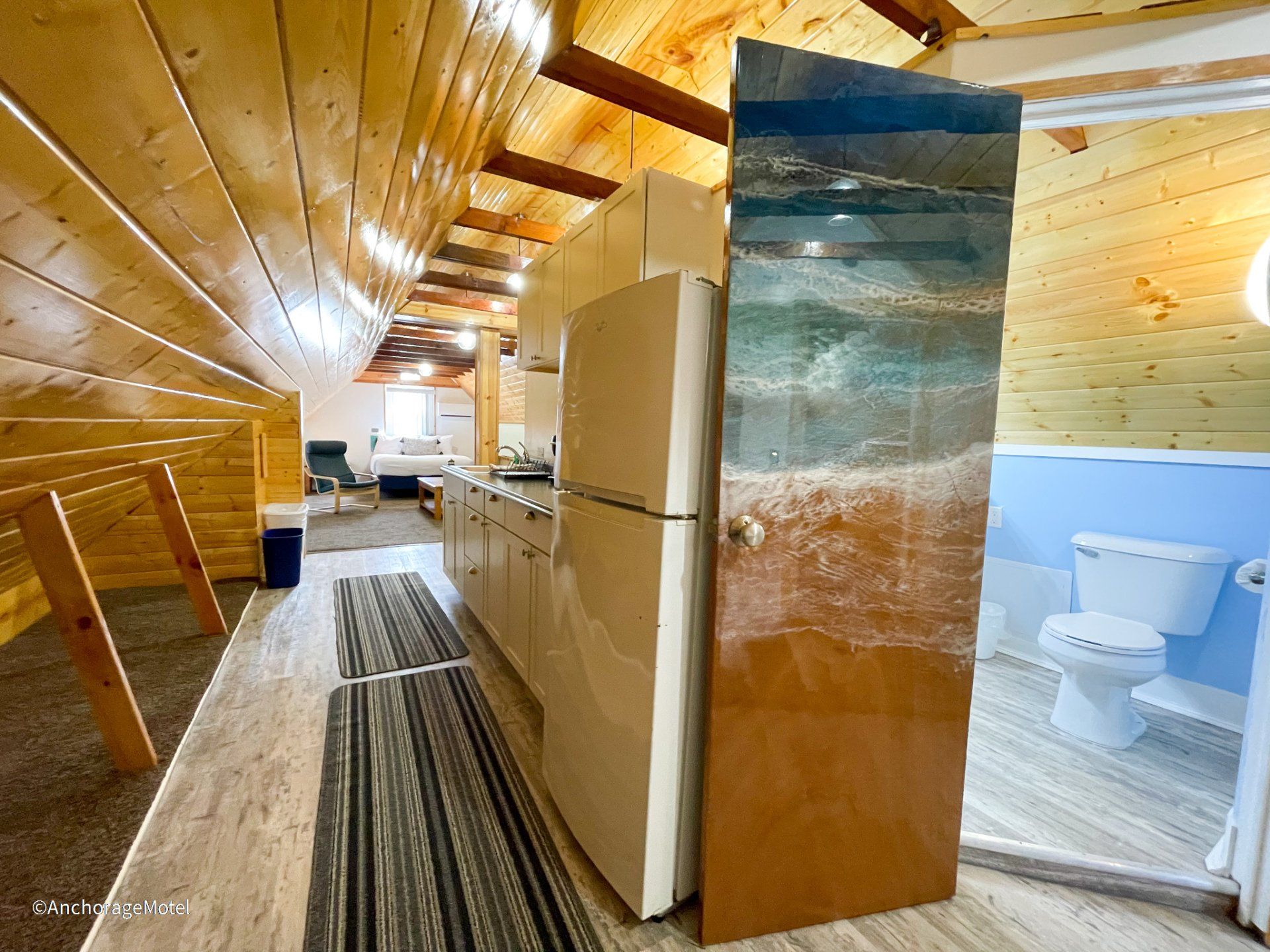 The Loft Suite is the largest of our suites at 735 square feet and is our only upstairs (no elevator) allergy friendly adults only suite at the Anchorage. To maintain allergy friendly status it is completely pet free no exceptions and meets the U.S. Department of Justice, American with Disabilities Act guidelines and regulations for being exempt from accepting service dogs making this a truly pet free space. This suite has a large private bedroom with a queen size bed, 43" Roku Smart TV and seating area to relax and enjoy a cup of coffee in the morning. The galley style kitchenette offers an apartment size refrigerator with freezer, two burner cooktop, microwave, Keurig coffee maker and a basic set of dishes, pots/pans, utensils and glassware. The living room area has a queen size bed, a couch (due to local health code ordinances this couch is not a sleeping surface) with a 43" Smart TV. There is also a HEPA air filter, it's own HEPA vacuum cleaner to ensure no cross contamination of pet dander. Our loft suite features custom artwork by local artists throughout.