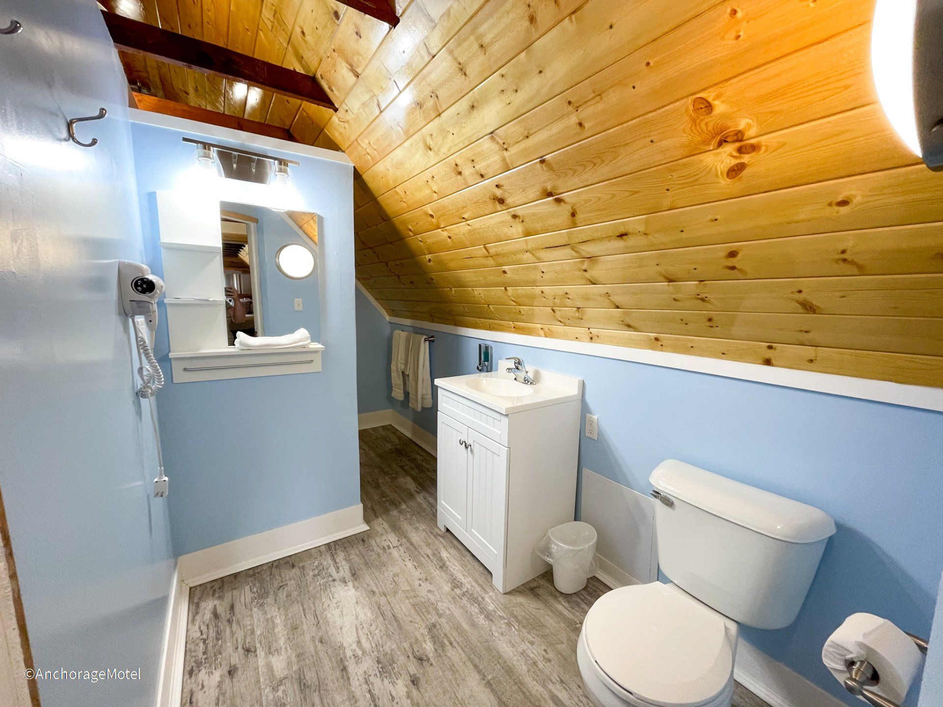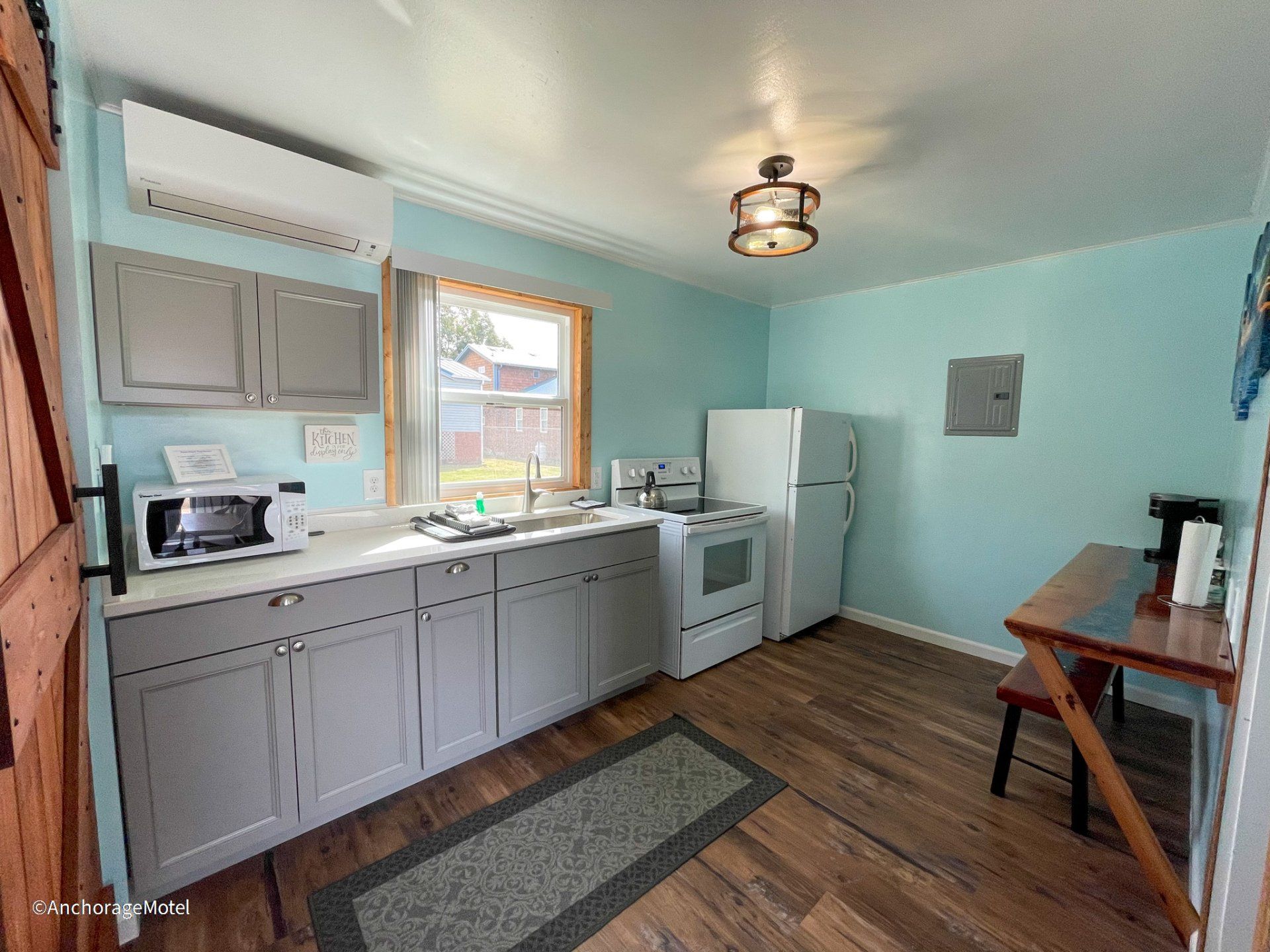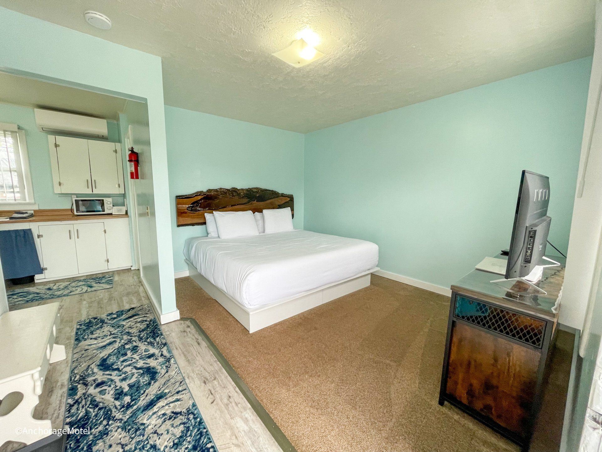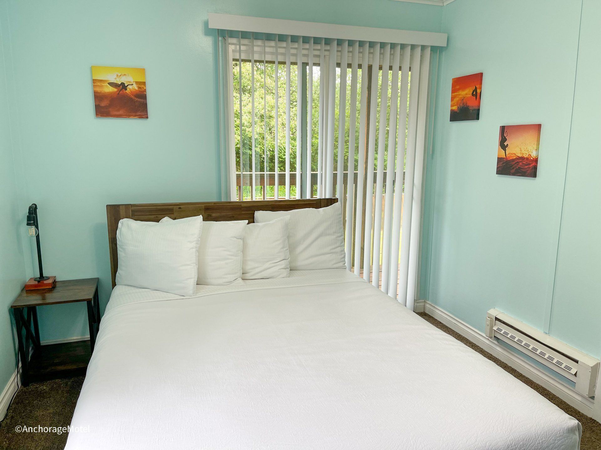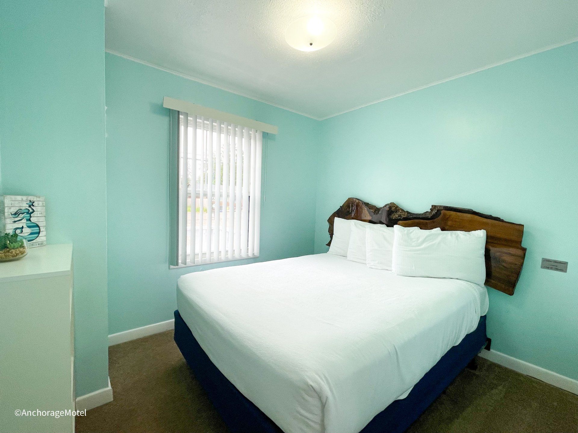 The Loft Suite is the largest of our suites at 735 square feet and is our only upstairs (no elevator) allergy friendly adults only suite at the Anchorage. To maintain allergy friendly status it is completely pet free no exceptions and meets the U.S. Department of Justice, American with Disabilities Act guidelines and regulations for being exempt from accepting service dogs making this a truly pet free space. This suite has a large private bedroom with a queen size bed, 43" Roku Smart TV and seating area to relax and enjoy a cup of coffee in the morning. The galley style kitchenette offers an apartment size refrigerator with freezer, two burner cooktop, microwave, Keurig coffee maker and a basic set of dishes, pots/pans, utensils and glassware. The living room area has a queen size bed, a couch (due to local health code ordinances this couch is not a sleeping surface) with a 43" Smart TV. There is also a HEPA air filter, it's own HEPA vacuum cleaner to ensure no cross contamination of pet dander. Our loft suite features custom artwork by local artists throughout.