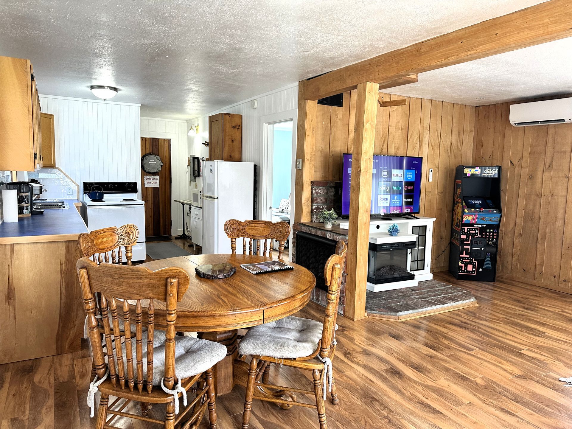 King Suite (No Pets) – Our King Suite features a custom beach themed wall mural and black walnut slab headboards with a king size bed in the front room and a queen size bed in the bedroom off of the kitchen. In the front bedroom guests will have a 43" Roku Smart TV. This suite is equipped with a full kitchen featuring a full size refrigerator and freezer, four burner range with full size oven, microwave, toaster, and Keurig coffee maker. The kitchen offers guests a basic set of dishes, pots/pans, glassware and utensils. Guests are provided coffee, creamer, sugar, salt and pepper. We do not provide additional kitchen items.