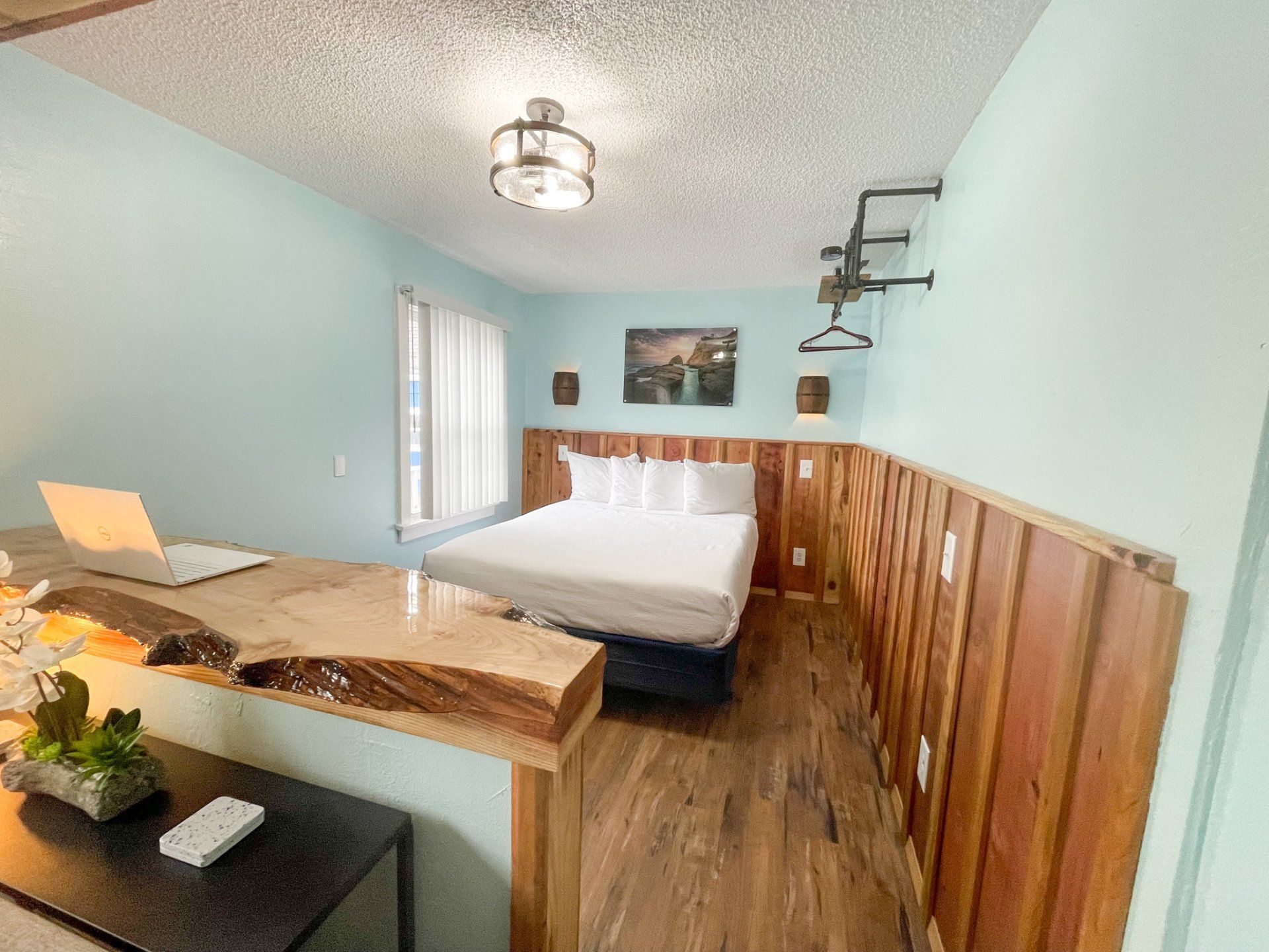 Our Deluxe Queen room is features a floor to ceiling custom wood headboard with one queen size bed, a small writing desk with drawer. This room has a built-in microwave, Keurig coffee maker, refrigerator with freezer and a 43" Roku Smart TV. The bathroom features a beautiful Kraus Ladon Glass Circular Vessel sink with faucet and a marble shower.